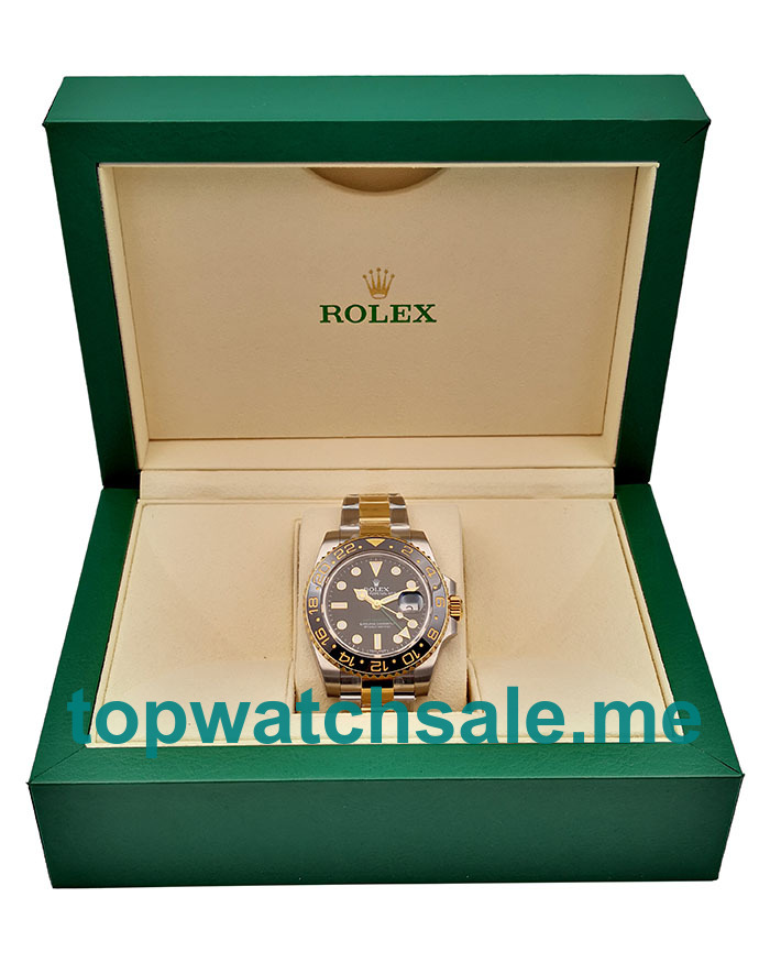 Our cheap Rolex GMT-Master II replica watches UK have the black dials and 40 mm stainless steel and gold cases, which are best option for men. Powered by the Swiss automatic movement, the luxury Rolex fake watches online work precisely.
